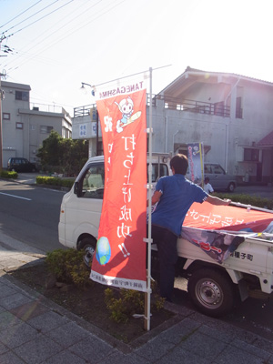 ペグを受け取り、懐かしいAコープで夕食の買い物を済ませて帰る途中、南種子町の人が沿道に「打ち上げ成功」ののぼりを立てていました。