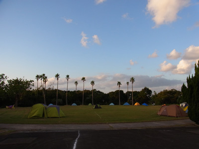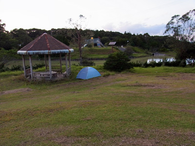 池のほとりに荷物を降ろし、4本だけのペグでチャッチャと仮設営。バックパックをテントに放り込み、郵便局目指して南種子の町へブラブラ徒歩行。