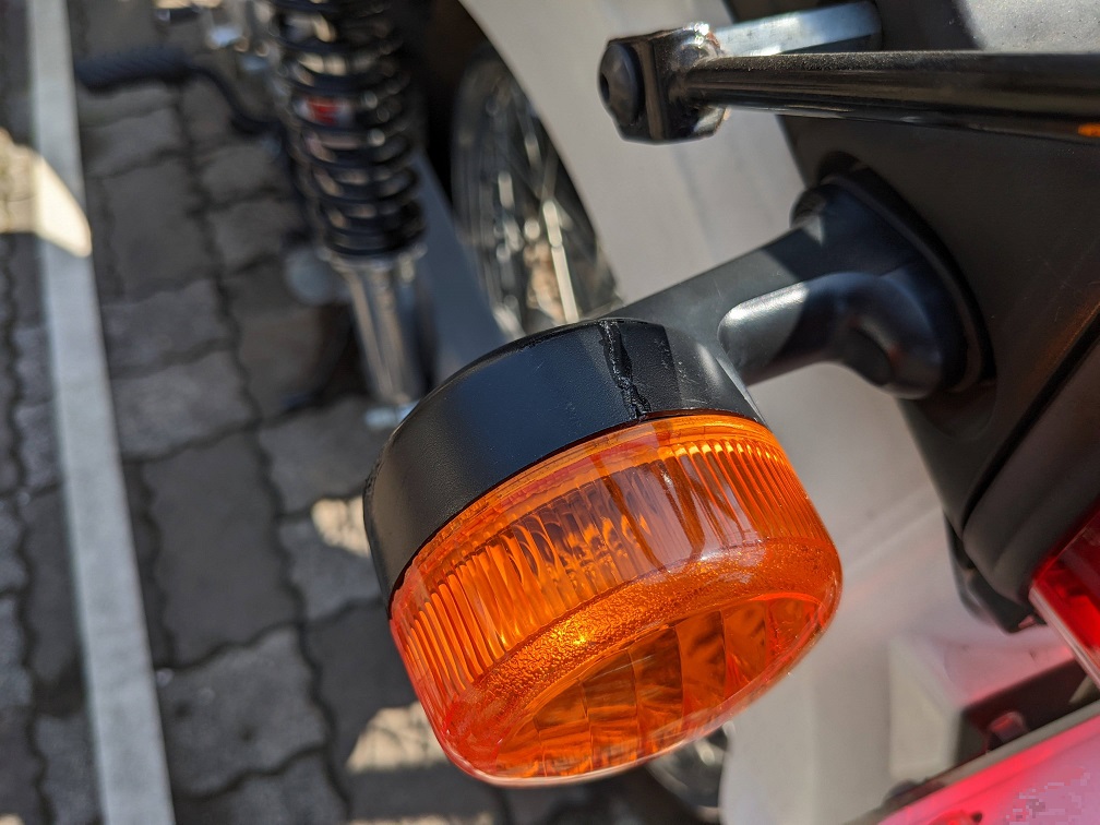 例によって前カゴが歪んだりバーエンドに傷が入ったりしましたが、傾斜地だったからか、この度は左のリアウィンカーの基部が派手に割れました…