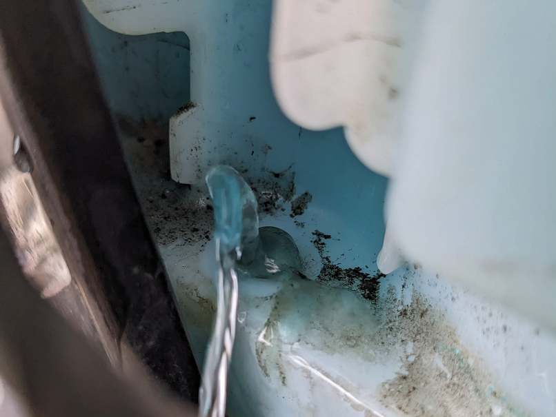 タンクのポンプ側の穴から残ったウォッシャー液の様子をのぞいてみると、小さいゴミもチラホラ。