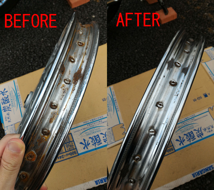 前輪を外して古タイヤ外してチューブとリムバンド取っ払ったら、結構錆びが。