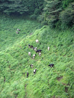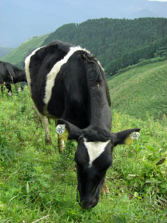写真中:大野山乳牛育成牧場。北海道とかの牧場と違ってかなりの斜度に、牛が貼りつく。