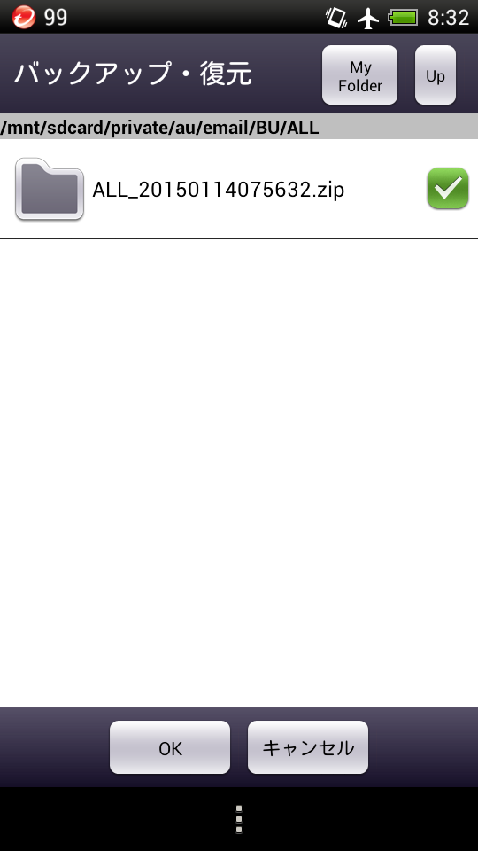 1分半くらいで丸まった2年分のメールデータをいったんPCに吸い上げ、新スマホの /mnt/sdcard/private/au/email/BU 以下にまるまるコピー。