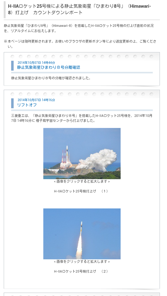 ひまわり8号が分離され、予定の軌道に投入されたとのこと。