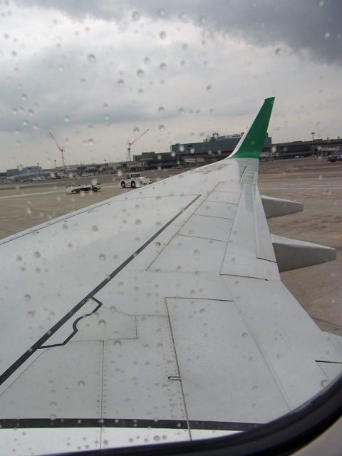 台風11号の影響と思われる小雨が降っていたので、タラップ車を上ってとっとと機内へ。