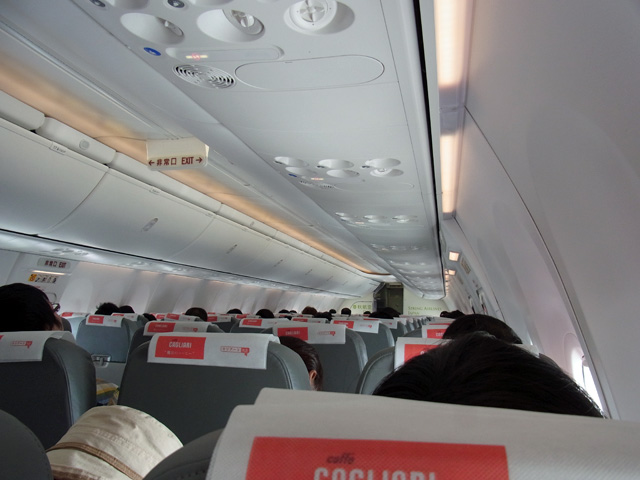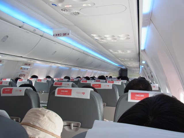 他のLCCと同じく革張りでシートピッチの狭い座席がならんでますが、