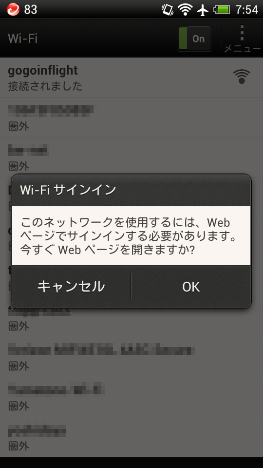 Wi-Fiを起動すると、"gogoinflight"なるSSIDがあったので接続してみると、