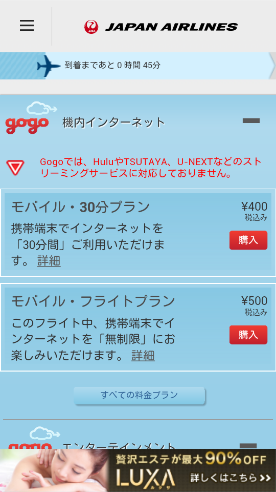 有料プランには「30分使える」・「フライト中ずっと使える」の二つがあるようで、その選択の参考のためか残り飛行時間が表示されてます。