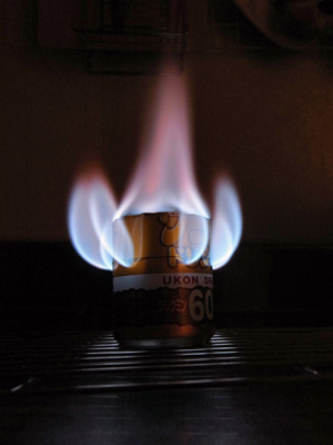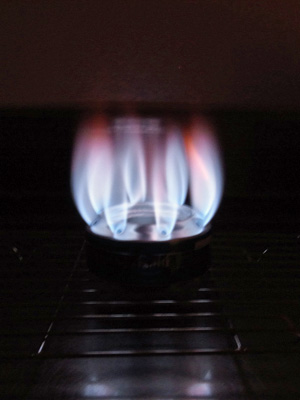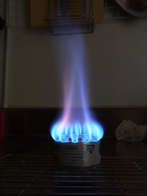 大さじ一杯の燃料用アルコールを注いで、燃焼実験!