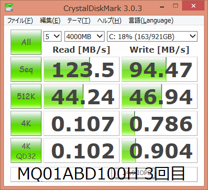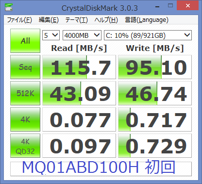 で、新旧HDDでCrystalDiskMarkやってみました。