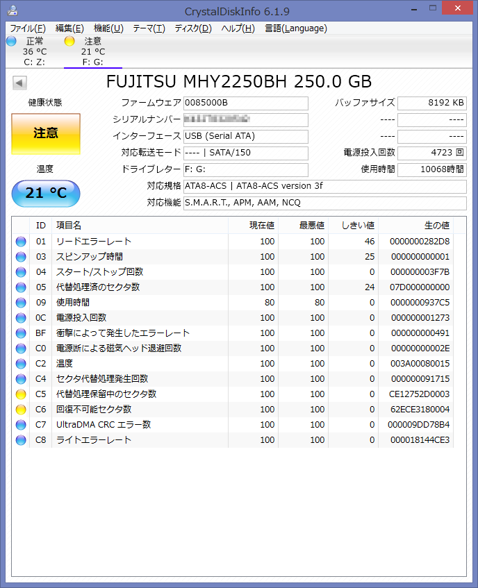 何気なくCrystalDiskInfoで旧HDDを調べてみたら、「回復不可能セクタ数」がエラいことになってました(汗)。