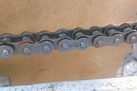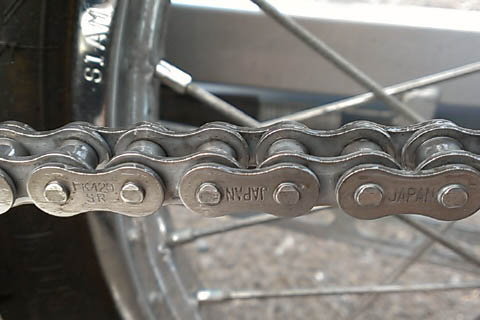 ちょっと錆が浮いてたりしてたんで、金ブラシでゴリゴリ磨いて、クレ・スーパーチェーンルブを多めに吹いておきました。