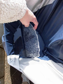 …前カゴに溜まった天水が、昨夜の冷え込みで凍ってました。見事な厚み。
