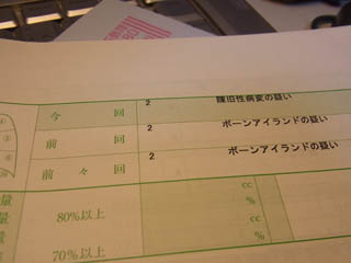 安定の胸部レントゲン・謎のボーン・アイランド(良性の骨肉腫?)が陳旧性病変(要は治った痕?)に、安定の尿蛋白"B"も"A"に。