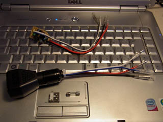 緑の「←」の先にあるのが12V→5Vコンバータ。無事、動作しました。修理完了。