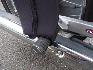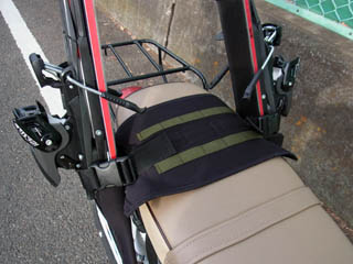 靴下のような部品でテールを覆い、落ちない&リアホイールに巻き込まれないよう、タンデムステップに連結。