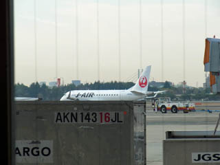 ちっちゃいから手前のカーゴに半分隠れちゃってますが、JALのエンブラエル170。いいねえ。