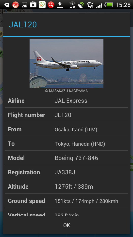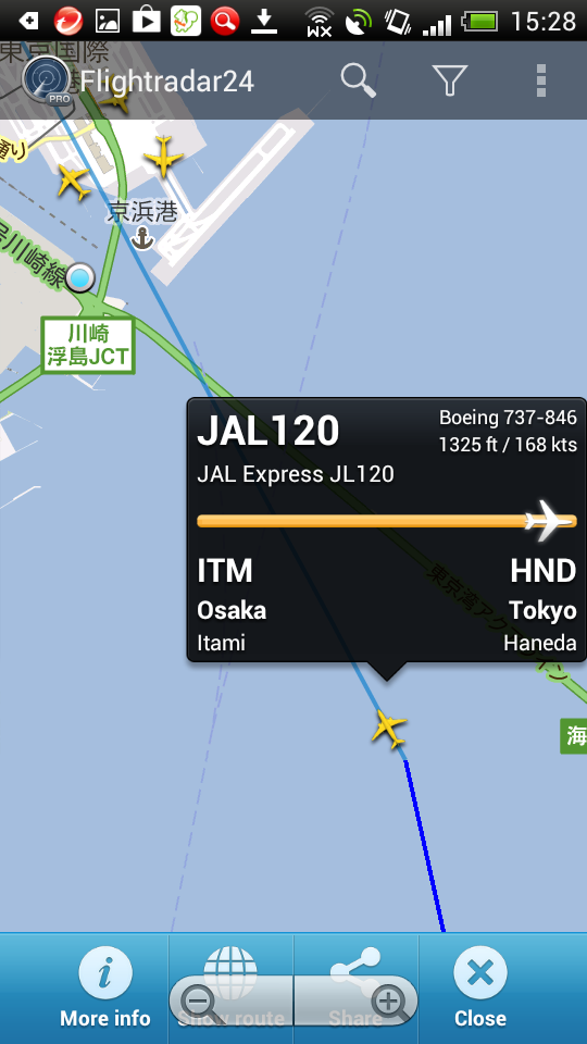 位置情報は数秒ごとの更新なので、こんな近距離だと画面上の飛行機にピタリ重なることはないけど、これは感動ものです。