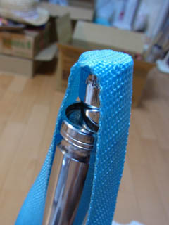 400円くらいで作れる簡便なものですが、ベルトの端のわっかにもう一方を通し、それを引っ張ることで、直接押し込むより少ない力でスプリングシートを押し込めます。