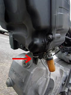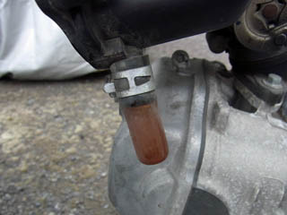 よくよく見ると、今まで一顧だにしなかったクランクケースブリーザドレンチューブ(透明の樹脂製のもの)が茶色のオイルであふれてます…