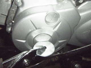 レッグシールドを外してフォークカバーを外す訳ですが…、