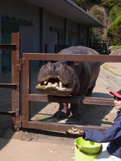 カバのブースに差し掛かったら、ちょうどえさやり体験の時間。